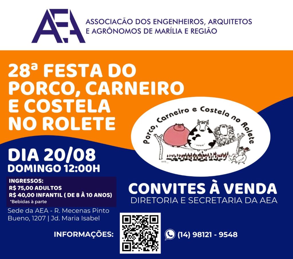 Quem desejar participar da 28ª edição do tradicional almoço Festa do Porco, Carneiro e Costela no Rolete da Associação dos Engenheiros, Arquitetos e Agrônomos de Marília (AEA Marília) poderá adquirir neste sábado, dia 19 de agosto, convites que estarão sendo comercializados em plantão especial que funcionará das 8h às 17 horas. Diretores estarão na sede da entidade neste período e os convites podem ser adquiridos a R$ 75 – no domingo, no almoço, consumo de bebida será à parte. A AEA fica na rua Mecenas Pinto Bueno, nº 1207, perto do Esmeralda Shopping.