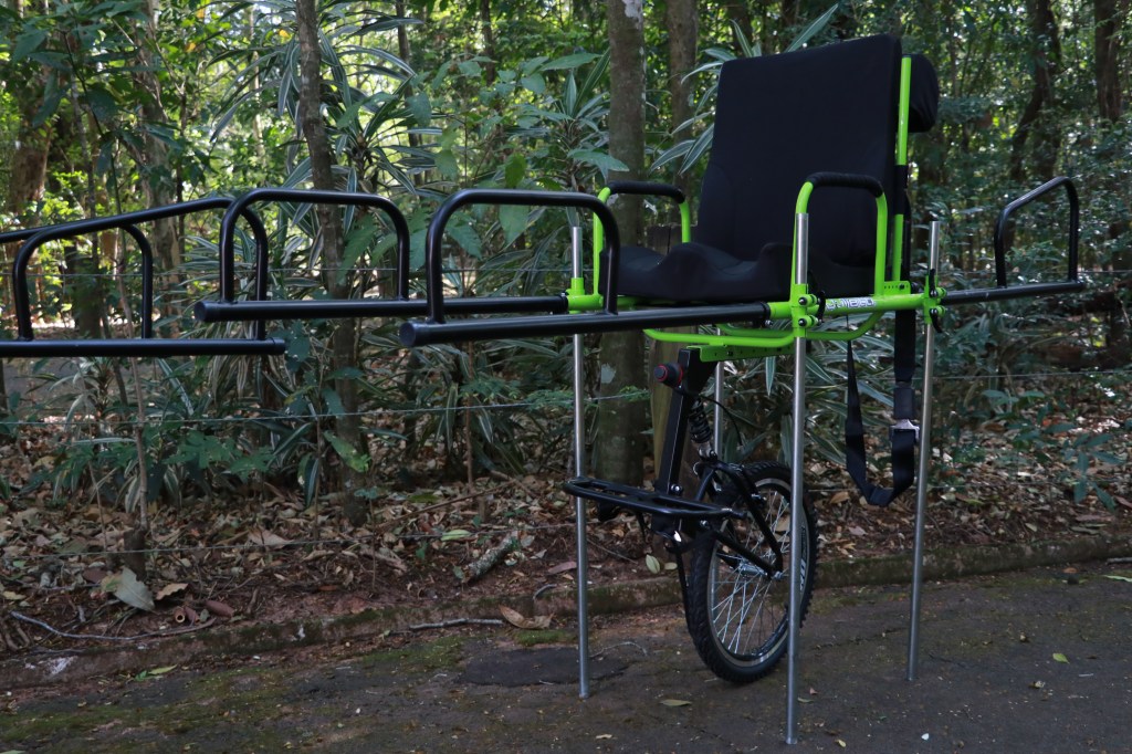 A cadeira, de modelo “Julietti”, é feita de aço-carbono, conta com um sistema de amortecimento, cinto de segurança, apoio para os pés e cabeça e suporta até 90Kg. Além de transportar pessoas com deficiência física ou mobilidade, o equipamento pode ser usado também como resgate em caso de acidentes em pontos de difícil acesso nos parques.