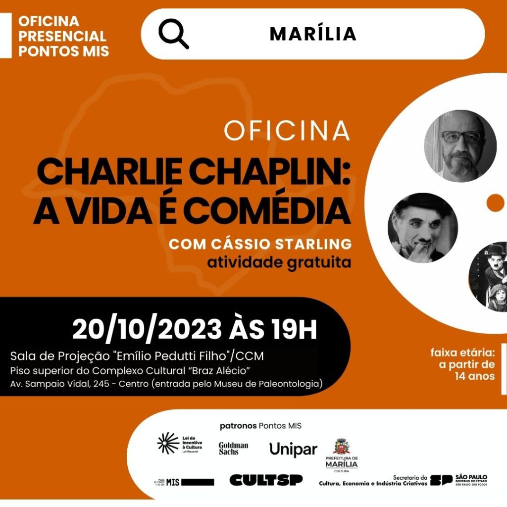A Secretaria Municipal da Cultura está com inscrições abertas para a oficina de audiovisual ‘Charlie Chaplin – A vida é comédia’, que acontecerá na próxima sexta-feira, dia 20 de outubro, no período das 19h às 22 horas, na Sala de Projeção ‘Emilio Pedutti Filho/CCM’, localizada na avenida Sampaio Vidal, nº 245, no piso superior.