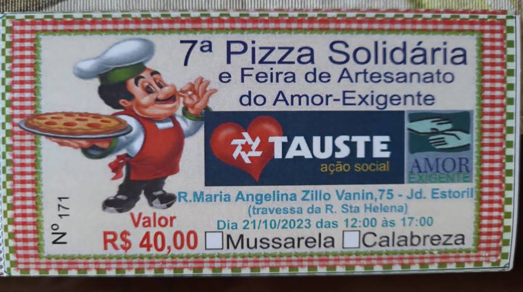 A Pizza Solidária do Amor Exigente conta com a ajuda principal do Tauste Ação Social, e apoio da Bel Alimentos, Tack Empreendimentos e Toca Imóveis. Quem quiser ajudar e conhecer o trabalho da entidade, as pizzas de mussarela ou calabreza estarão sendo vendidas das 12h às 17h na sede, que fica na Rua Maria Antelina Zillo Vanin, 75, uma travessa da Rua Santa Helena, na Zona Leste de Marília. A pizza custa R$ 40,00. Mais informações (14) 3414-1098.
