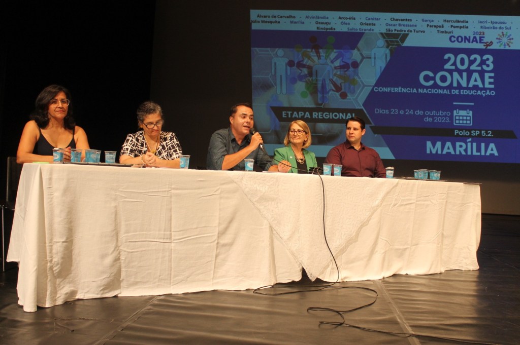 Educadores de Marília e de outros 22 municípios da região, a exemplo de Álvaro de Carvalho, Garça, Oscar Bressane e Vera Cruz, participaram entre os dias 23 e 24 de outubro – segunda e terça-feira desta semana – da etapa regional da Conferência Nacional de Educação 2024. A solenidade de abertura ocorreu na noite de segunda-feira, dia 23, no Teatro Municipal ‘Waldir Silveira Mello’, no centro, e reuniu autoridades locais, a exemplo do secretário municipal da Educação, professor Helter Bochi – que na ocasião representou o prefeito de Marília, Daniel Alonso, dirigente regional de ensino de Marília, professora doutora Ana Luiza Bernardo Guimarães, presidente do Conselho Municipal de Educação, professor Marcelo de Souza Fermino, secretária municipal da Educação de Garça, professora Janete Aparecida Barros Arranha Conessa e a professora Flávia Lopes de Cerqueira Gimenes de Oliveira, coordenadora da comissão que organizou a etapa regional da conferência nacional.