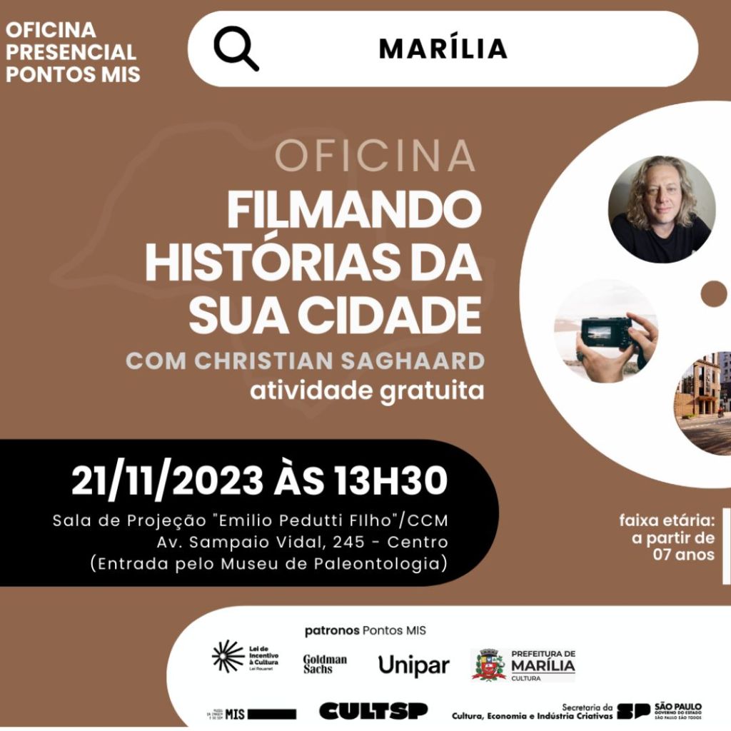 A Prefeitura Municipal de Marília e Secretaria Municipal da Cultura abre período para as inscrições da oficina gratuita de cinema ‘Pontos MIS: filmando histórias da sua cidade’, que será realizada em 21 de novembro, das 13h30 às 17h30, na Sala de Projeção ‘Emílio Pedutti Filho’/CCM (avenida Sampaio Vidal, n.º 245, piso superior, centro de Marília). A capacitação acontece com apoio do Museu da Imagem e do Som (MIS).