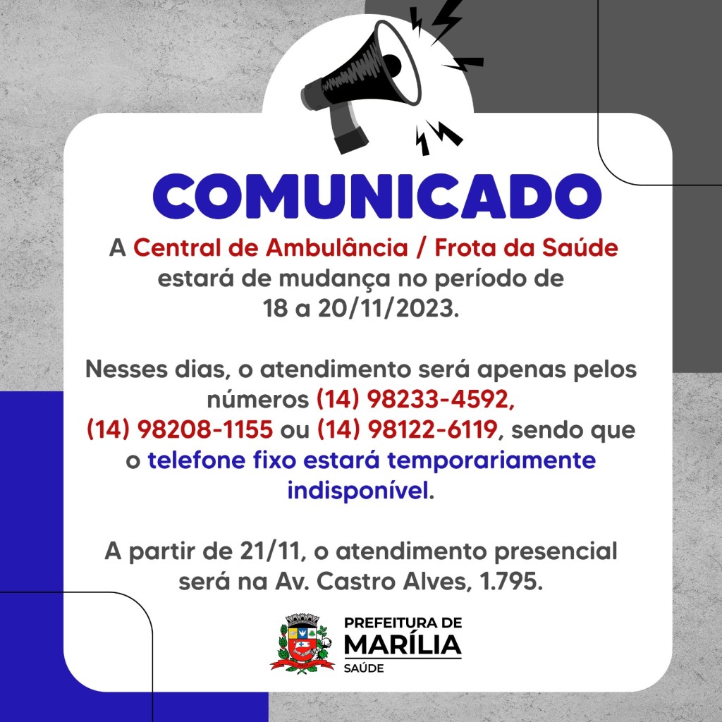 Não há previsão de quando o número fixo usual seja transferido e religado (o número, 14-3434-2300). Para não prejudicar o atendimento à população, três números de celular vão ficar disponíveis para receber o agendamento dos serviços: 14-98233-4592, 14-98208-1155 e 14-981226119. A Central de Ambulância é um serviço gratuito da Prefeitura de Marília que funciona de segunda-feira a domingo, das 7 h às 19h, colocando à disposição da população do município o transporte de pacientes do SUS (Serviço Único de Saúde) para atendimentos em outros municípios, após alta hospitalar, locomoção entre hospitais e pronto-atendimentos.