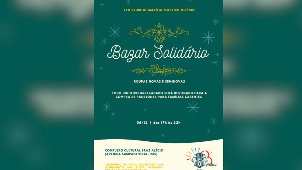 No espírito de solidariedade e generosidade, o LEO Clube de Marília Terceiro Milênio promoverá um Bazar Solidário no próximo dia 06 de dezembro, a partir das 17h. O evento tem como objetivo arrecadar fundos para as campanhas de Natal da entidade, visando levar alegria e assistência a comunidades carentes durante as festividades.
