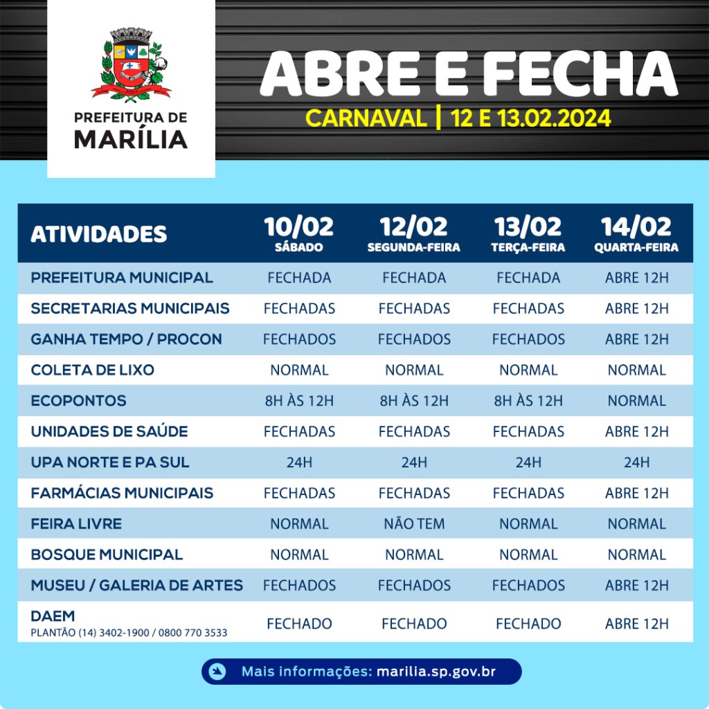 A administração municipal divulgou a relação dos serviços que funcionarão durante os dias de folia e o que não funcionará. O destaque será a coleta de lixo que acontecerá todos os dias normalmente. Já as unidades de saúde dos bairros, funcionarão até sexta-feira dia 9, e retornarão na quarta-feira dia 14, à partir das 12h.