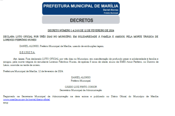 Diante da repercussão que o crime teve na sociedade, o município de Marilia decretou Luto Oficial por três dias em Marília.