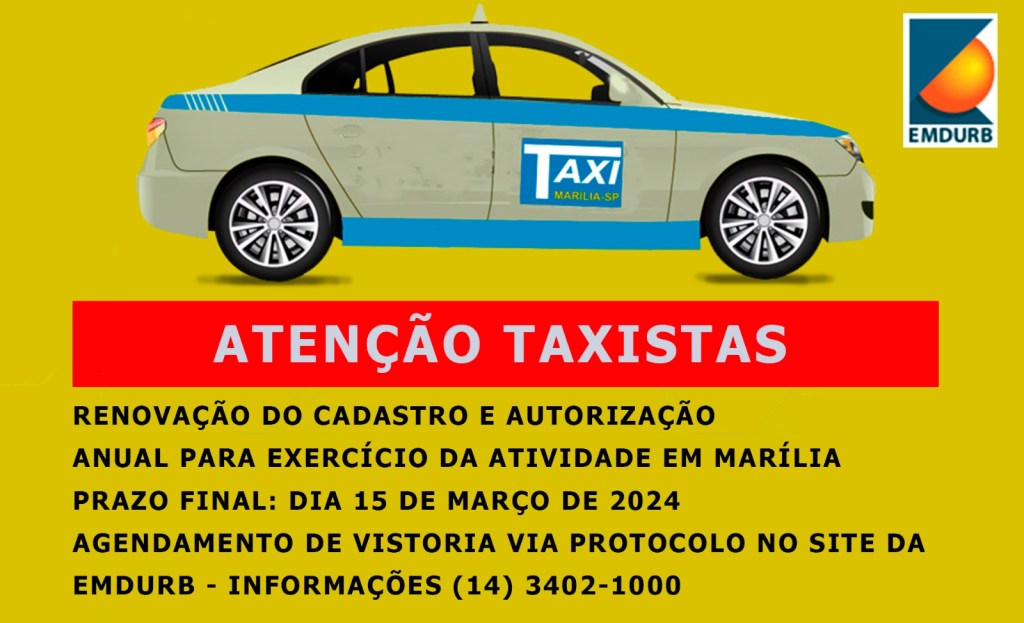Atenção taxistas! A Empresa de Mobilidade Urbana de Marília (Emdurb) informa que termina no próximo dia 15 de março o prazo para realizar a atualização do cadastro e renovação da autorização anual da atividade no município de Marília. No ato, é necessária a apresentação da documentação exigida por lei, realização de vistoria veicular e recolhimento de taxa.