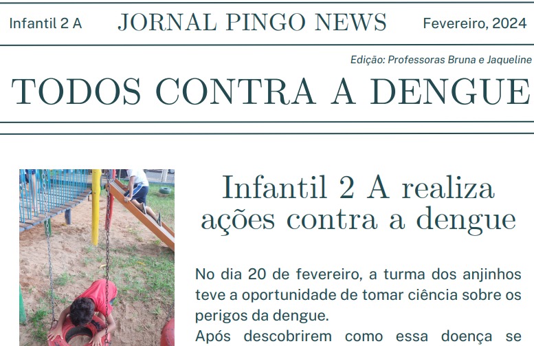 Na primeira edição do Jornal Pingo News, a unidade de ensino traz matérias sobre limpeza da área verde da escola, noções de cidadania, dicas de limpeza e ainda uma exposição de arte, que desenhos colocados no hall de entrada da escola para que famílias, funcionários e outras crianças tenham acesso e percebam a relevância do combate a dengue.