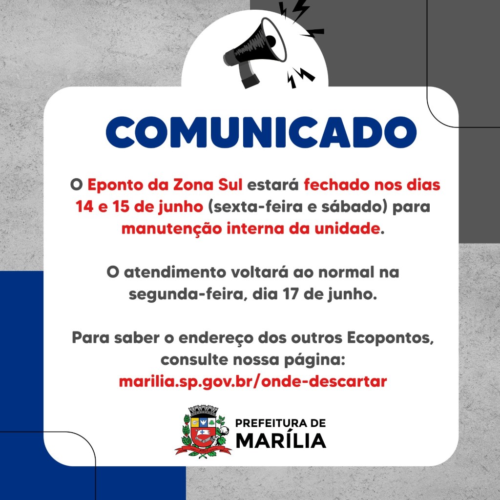 A Prefeitura Municipal de Marília, através da Secretaria Municipal de Limpeza Pública e Serviços, informa que o Ecoponto da Zona Sul, localizado na rua Joaquim Dias, ao lado do Complexo de Trânsito, estará fechado nesta sexta-feira, dia 14, e no sábado, dia 15 de junho, para manutenção interna.