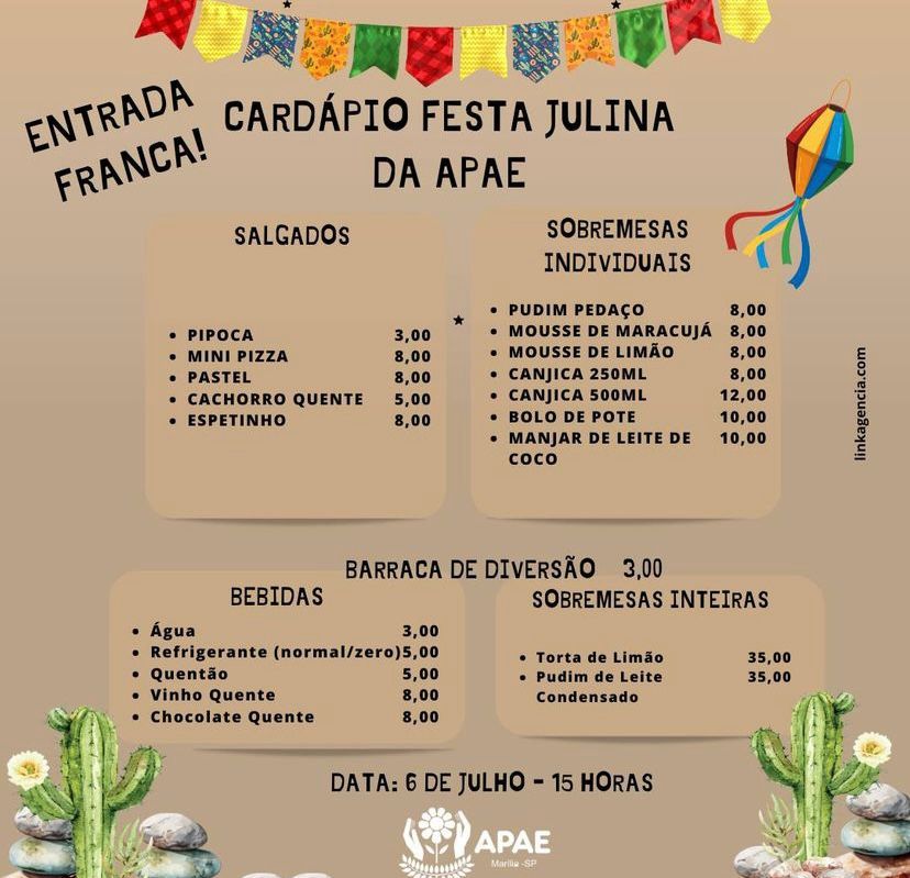 A Associação de Pais e Amigos dos Excepcionais (Apae) de Marília convida a comunidade para sua tradicional festa julina, que será realizada neste sábado (6), a partir das 15h, na sede da instituição, localizada na rua Raul Torres, 70. Com entrada franca, o evento promete uma tarde repleta de diversão, comidas típicas e apresentações culturais.