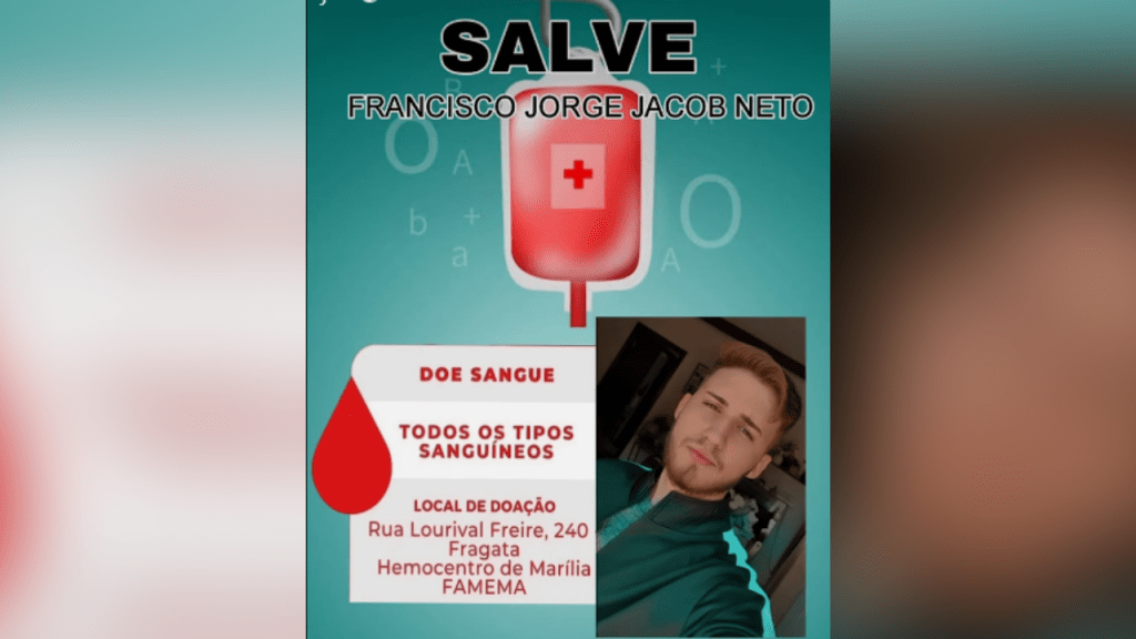 A família de Francisco Jorge Jacob Neto está mobilizando as redes sociais em uma campanha de doação de sangue e orações pela recuperação do jovem. Jacob Neto foi vítima de um grave acidente de trânsito em Marília na última sexta-feira (05), por volta das 19h, quando voltava para casa após mais um dia de trabalho.