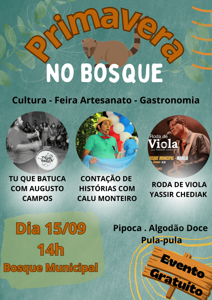 Com um programa cheio de artesanato, gastronomia, música, contação de histórias, pula-pula, distribuição de algodão doce e pipoca, a Secretaria Municipal de Cultura de Marília (em conjunto com a Secretaria Municipal do Meio Ambiente, e apoio da Prefeitura Municipal de Marília) realiza no próximo domingo, 15 de setembro de 2024, o evento ‘Primavera No Parque’, com programação gratuita para preencher do fim de semana em família no Bosque Municipal ‘Rangel Pietraróia’. Um parque perfeito para piqueniques, pequenas caminhadas e para admirar o verde das árvores nativas da Mata Atlântica e totalmente preservadas neste bosque.