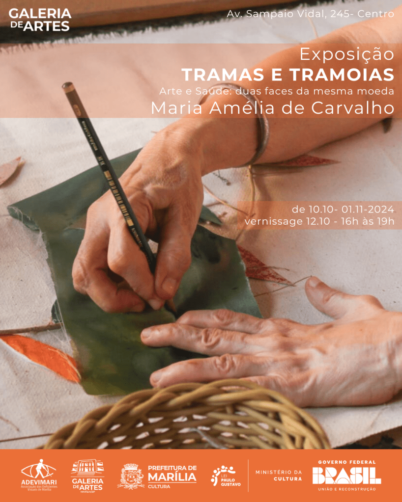 A Secretaria Municipal da Cultura de Marília e a Galeria Municipal de Artes de Marília abrem neste sábado, dia 12 de outubro, a partir das 16 horas, a exposição ‘Tramas & Tramoias: arte e saúde, duas faces da mesma moeda’. A mostra é assinada pela artista plástica Maria Amélia de Carvalho, tem classificação livre e entrada, podendo ser visitada pelo público até o próximo dia 1º de novembro de 2024.