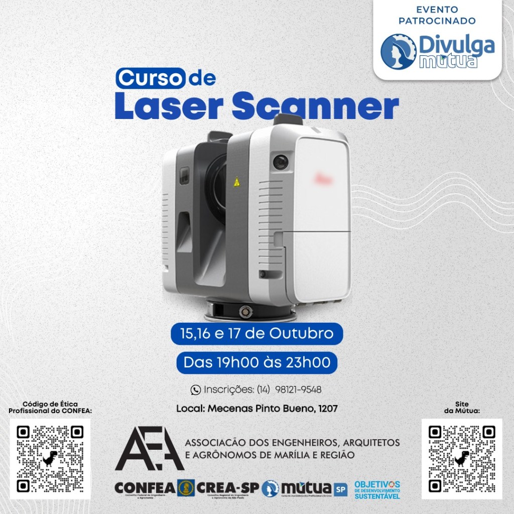 A AEA (Associação dos Engenheiros, Arquitetos e Agrônomos) de Marília realizará nos dias 15, 16 e 17 de outubro de 2024, o curso de utilização de laser scanner nos serviços de engenharia e na elaboração de tour virtual, recurso que vem sendo muito utilizado na construção civil. O treinamento será ministrado pelo engenheiro agrônomo Rafael Matsuoka, que tem pós-graduação em georreferenciamento de imóveis rurais, e acontecerá no período das 19h às 23 horas. A iniciativa tem apoio da Mútua São Paulo e do Conselho Regional de Engenharia e Agronomia do Estado de São Paulo (Crea SP) e transmitirá técnicas avançadas de escaneamento e processo de digitalização tridimensional.