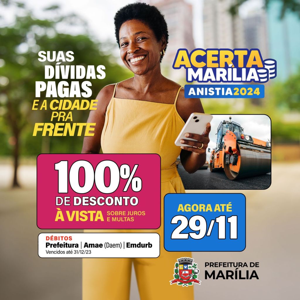 O prazo para adesão ao programa Acerta Marília segue até 29 de novembro e abrange débitos da Prefeitura Municipal de Marília, do Departamento de Água e Esgoto de Marília (Daem) e da Empresa Municipal de Mobilidade Urbana de Marília (Emdurb). Serão contemplados débitos vencidos até 31 de dezembro de 2023, inscritos em dívida ativa, mesmo que protestados ou não, discutidos judicialmente ou não.