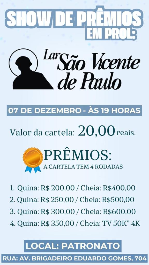 Participe do Show de Prêmios no dia 7 de dezembro, no Patronato (av. Brigadeiro Eduardo Gomes 704), e ajude o Lar São Vicente de Paulo a continuar seu trabalho. Adquira suas cartelas de forma antecipada ou na hora do evento. Sua presença e contribuição são essenciais para fazer a diferença na vida dos idosos atendidos pela instituição.