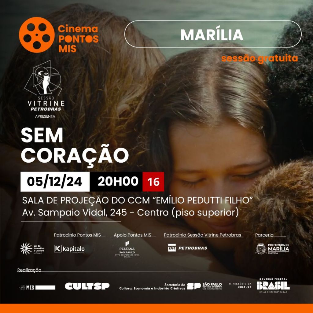 A Secretaria Municipal da Cultura de Marília, em parceria com Museu da Imagem e do Som, por meio do Pontos MIS, apresenta nesta quinta-feira, dia 5 de dezembro de 2024, às 20h, o filme nacional ‘Sem Coração’. O longa-metragem, que tem classificação etária de 16 anos, foi inteiramente gravado no Estado de Alagoas e lançado neste ano de 2024.