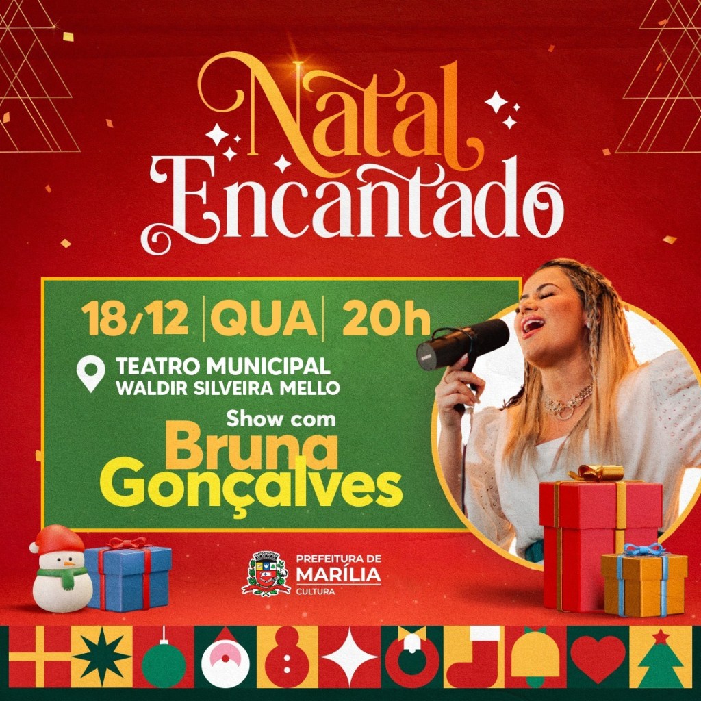 A Secretaria Municipal da Cultura de Marília e a Associação Comercial e de Inovação de Marília (Acim) realizam amanhã, quarta-feira, dia 18 de dezembro, às 20 horas, o show da cantora sertaneja Bruna Gonçalves no Teatro Municipal de Marília. O espetáculo tem entrada gratuita por ordem de chegada.