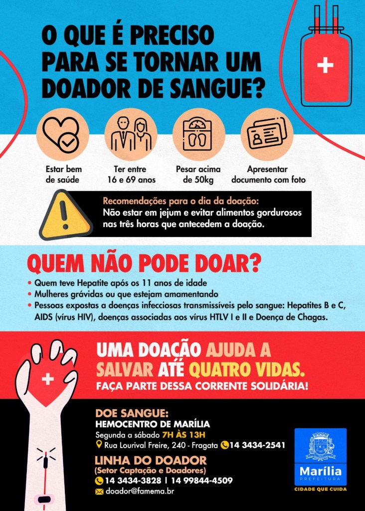 Podem doar sangue as pessoas entre 16 e 69 anos que estejam com boa saúde e com peso acima de 50kg. Para ser atendido, é necessário apresentar documento com foto. Para o dia da doação, recomenda-se que o doador não esteja em jejum e evite alimentos gordurosos nas três horas que antecedem a doação.