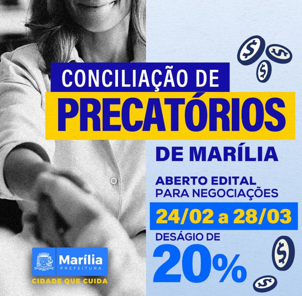 A Prefeitura de Marília, por meio da Câmara de Conciliação de Precatórios do Município, recebe até a próxima sexta-feira (dia 28 de março) propostas dos credores de precatórios do município para celebração do acordo e recebimento antecipado dos créditos, mediante o deságio (desconto) de 20% do valor atualizado do precatório, conforme publicado no Edital 01/2025