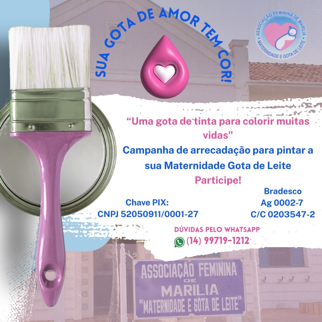 A Gota de Leite lança a campanha social Sua Gota de Amor tem Cor. O objetivo é levantar fundos para que a diretoria voluntária consiga pintar a entidade, que é 100% SUS. Em quase 94 anos, a maternidade responde pelo nascimento de mais de cem mil vidas. Ou seja, sua história também é a história das famílias marilienses e de toda região.