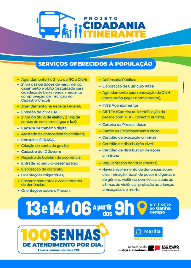 A Prefeitura de Marília, em parceria com a Secretaria da Justiça e Cidadania do Governo do Estado, trará para a cidade o projeto “Cidadania Itinerante” nos dias 13 e 14 de junho. Os atendimentos acontecerão em frente ao Ganha Tempo, no centro da cidade.