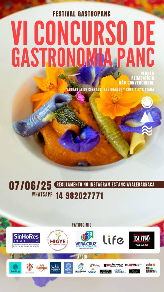 A Secretaria Municipal de Trabalho, Turismo e Desenvolvimento Econômico de Marília divulga a realização da sexta edição do concurso de gastronomia com plantas alimentícias não convencionais (PANC). O único concurso de gastronomia com PANC do Brasil cresceu e, este ano, transforma-se no Festival Gastropanc. O tradicional concurso de receitas acontece no sábado (7), das 9h às 14h, na Estância Vale da Graça, em Vera Cruz, a apenas 14 km de Marília.