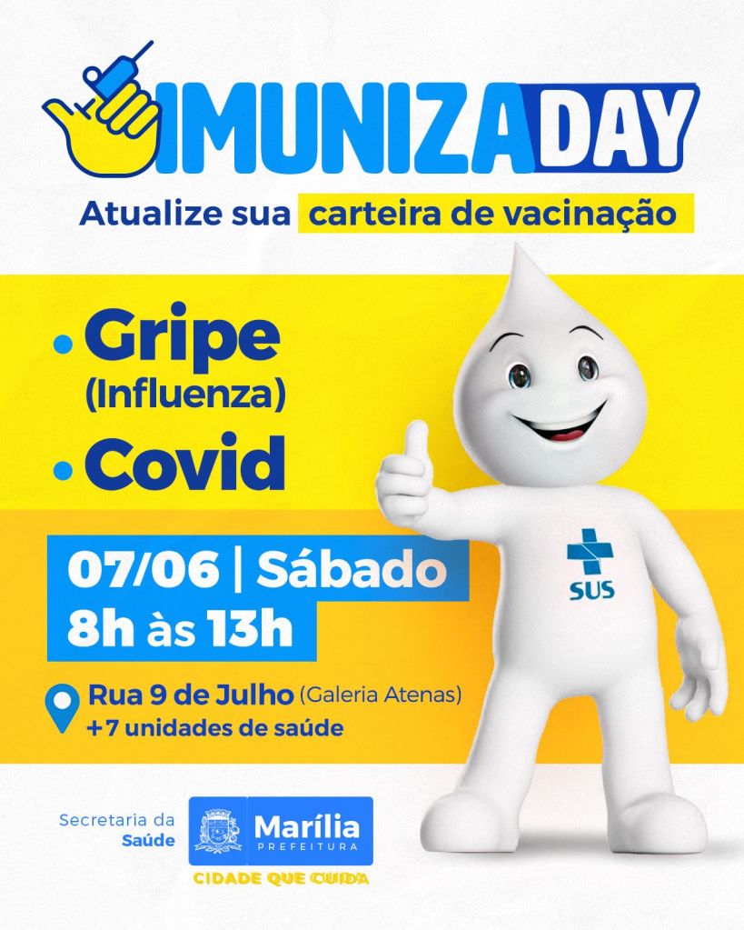 O “Imuniza Day”, série de ações voltadas à ampliação da cobertura vacinal, promovido pela Prefeitura de Marília, por meio da Secretaria Municipal da Saúde, acontecerá neste sábado (7), das 8h às 13h, em posto móvel na região central e em mais oito unidades que estarão abertas.
