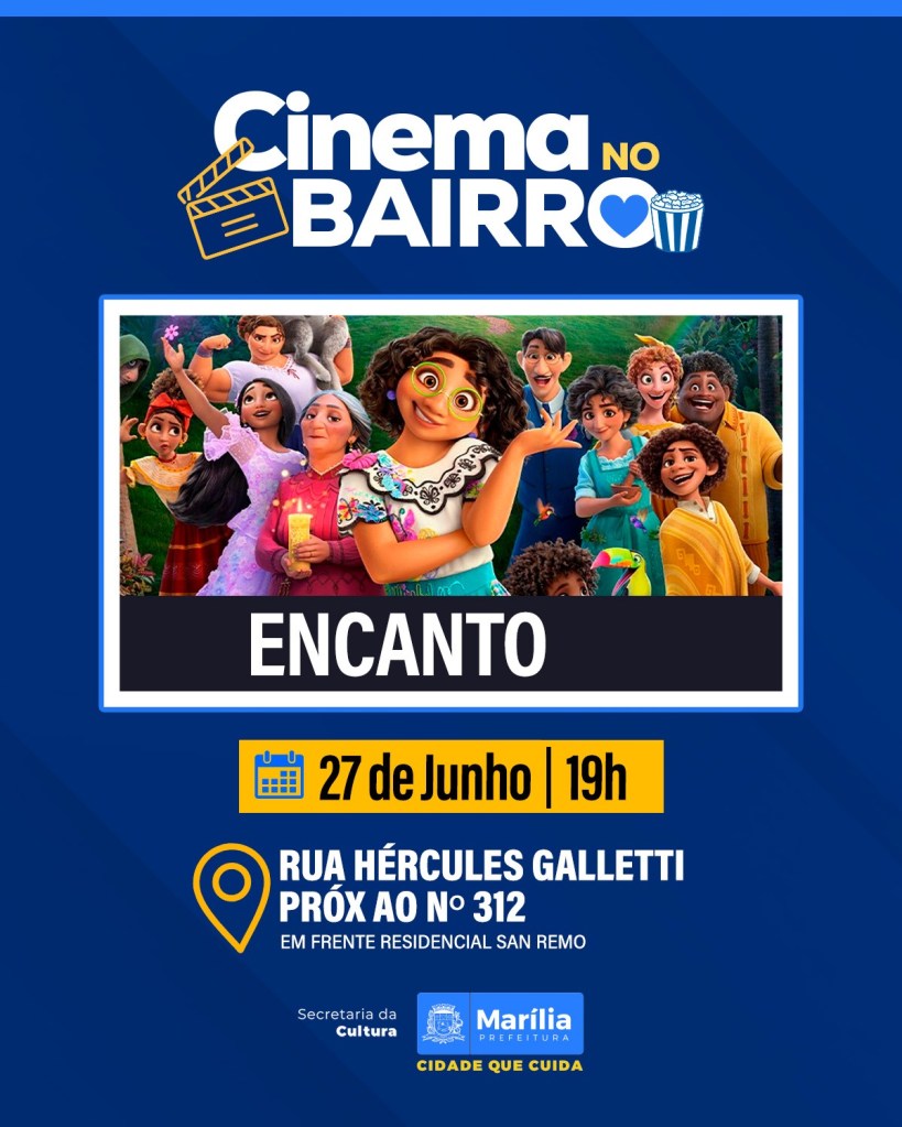Realizado mensalmente, o Cinema no Bairro percorre todos os bairros da cidade. A sessão desta sexta-feira será às 19h, com exibição do filme Encanto. Haverá distribuição gratuita de pipoca e algodão doce.