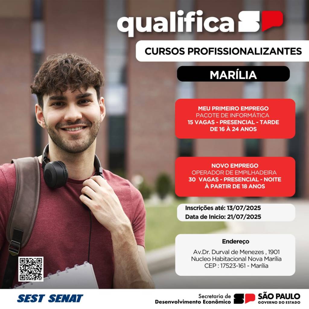 A Prefeitura de Marília, por meio da Secretaria Municipal do Trabalho, Turismo e Desenvolvimento Econômico, informa que o Governo Estadual e o SEST SENAT anunciaram a abertura de novas turmas do projeto QualificaSP, uma iniciativa voltada à qualificação profissional de cidadãos paulistas. O projeto oferece cursos gratuitos com certificados, com início previsto para o dia 21 de julho de 2025. As inscrições estão abertas até o dia 13 de julho de 2025, exclusivamente pelo site www.qualificasp.sp.gov.br.