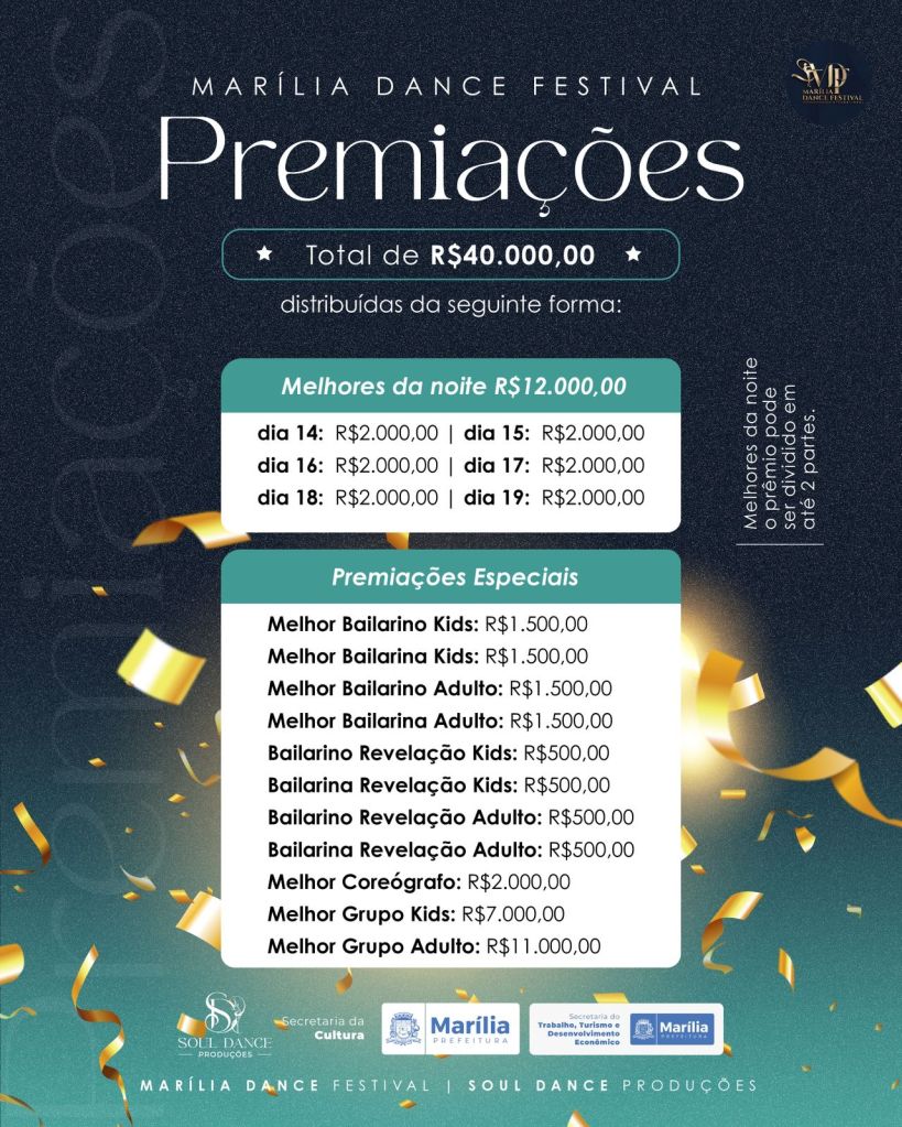 A cidade de Marília receberá de 14 a 20 de julho o Marília Dance Festival, uma parceria entre Prefeitura de Marília – por meio das Secretarias da Cultura e Trabalho, Turismo e Desenvolvimento Econômico, e a Soul Dance Produções. Evento de caráter internacional, será realizado anualmente, sendo oferecido neste ano a premiação de R$40 mil em dinheiro e bolsas internacionais para os vencedores.