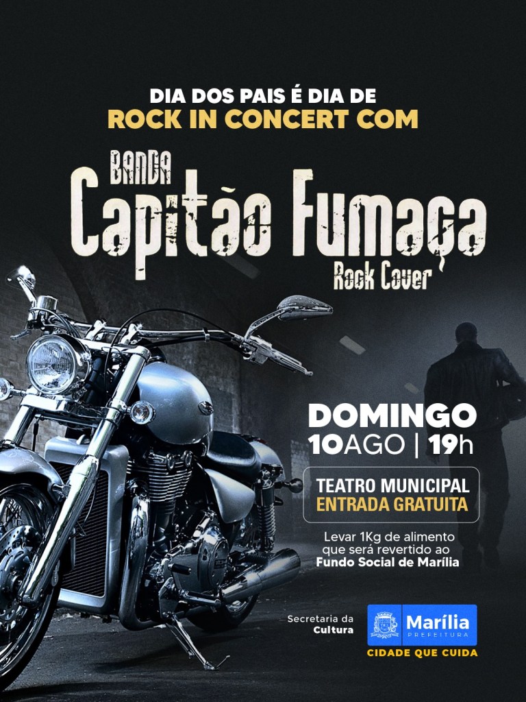 A Prefeitura de Marília, por meio da Secretaria Municipal da Cultura, apresenta show especial em comemoração ao dia dos pais. A cidade de Marília será embalada por clássicos do rock nacional e internacional no próximo dia 10 de agosto, às 19h, com o show Rock in Concert da banda Capitão Fumaça, que sobe ao palco do Teatro Municipal em um evento especial. A apresentação terá entrada gratuita, e os ingressos poderão ser retirados na bilheteria do Teatro a partir das 18h no dia do evento.