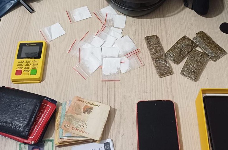 Durante a revista pessoal, os policiais encontraram quatro tabletes de maconha, além de um aparelho celular, uma máquina de cartão, R$ 1.037,00 em dinheiro e um segundo celular armazenado em uma caixa, acompanhado de três capas de telefone. O suspeito alegou que o segundo celular seria destinado a um cliente.
