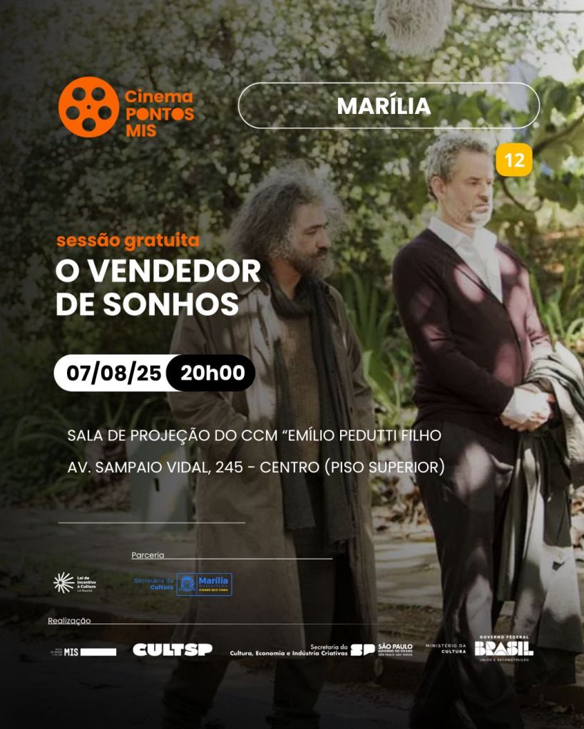 A Secretaria da Cultura de Marília, em parceria com Museu da Imagem e do Som – Pontos MIS, realizará nesta quinta, 7 de agosto, a exibição do filme brasileiro “O vendedor de sonhos”, com classificação indicativa de 12 anos.