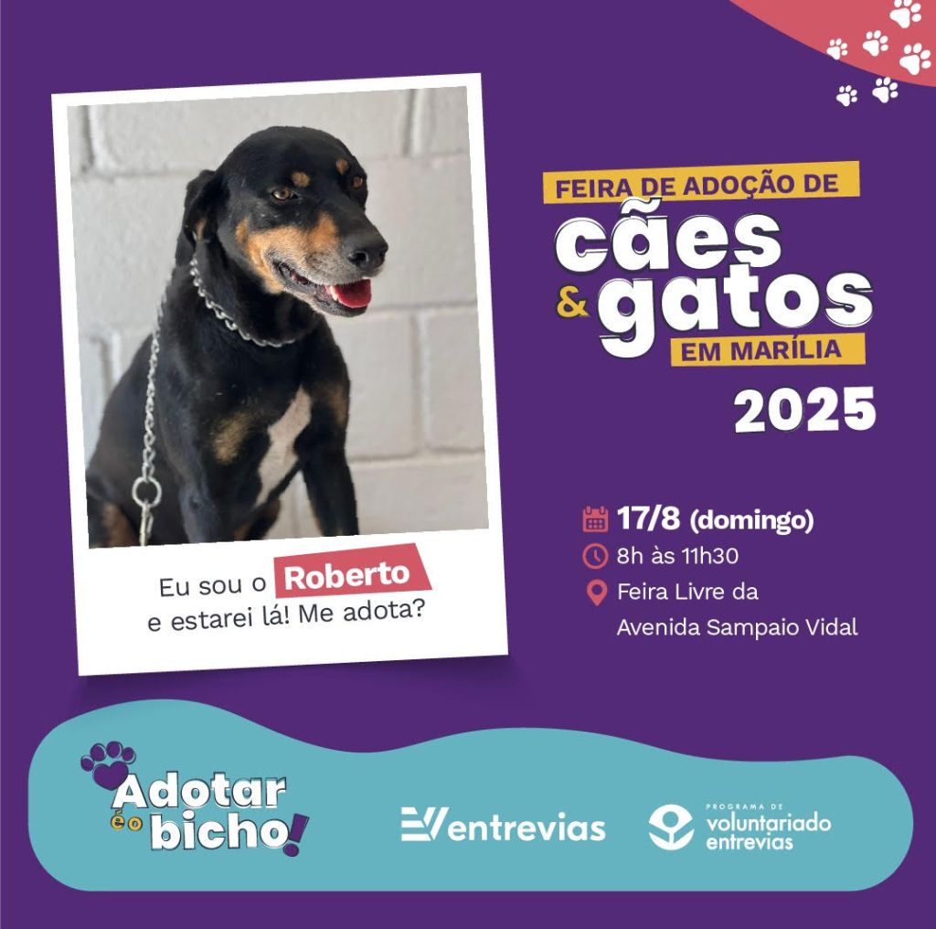 Neste domingo (17), a Entrevias Concessionária de Rodovias promove mais uma edição da feira de adoção de animais do programa Adotar é o Bicho. O evento será realizado durante a Feira Livre da Avenida Sampaio Vidal, em Marília, das 8h às 11h30. Todos os pets disponíveis para adoção foram resgatados pelas equipes da concessionária nas rodovias administradas pela empresa, onde estavam em situação de risco.