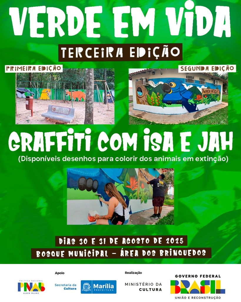 Nos dias 30 e 31 de agosto, o Bosque Municipal de Marilia recebe uma iniciativa que une arte urbana, educação e preservação ambiental. É o Verde em Vida, projeto idealizado pelos produtores culturais Jah e Isa e realizado com apoio da Prefeitura de Marília.