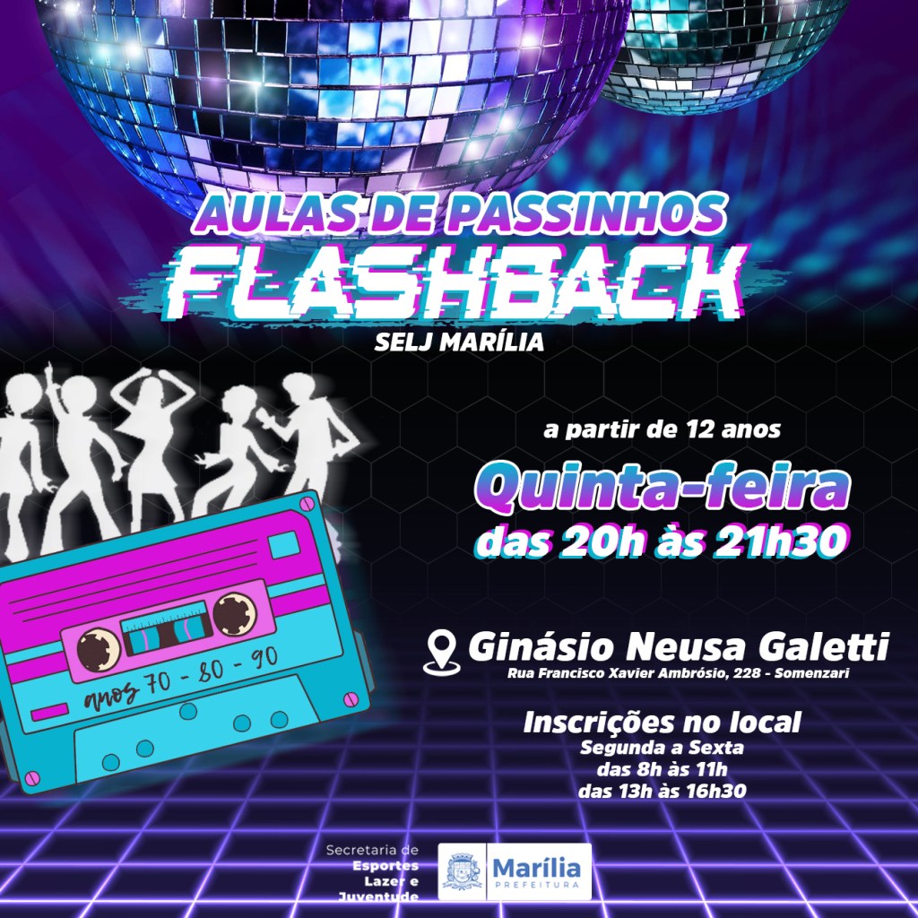 A Prefeitura de Marília, por meio da Secretaria Municipal de Esportes, inicia no próximo dia 11 de setembro, uma nova turma com aulas de passinhos de Flashback com os clássicos que marcaram gerações dos anos 70, 80 e 90, desta vez no Ginásio Neusa Galetti.