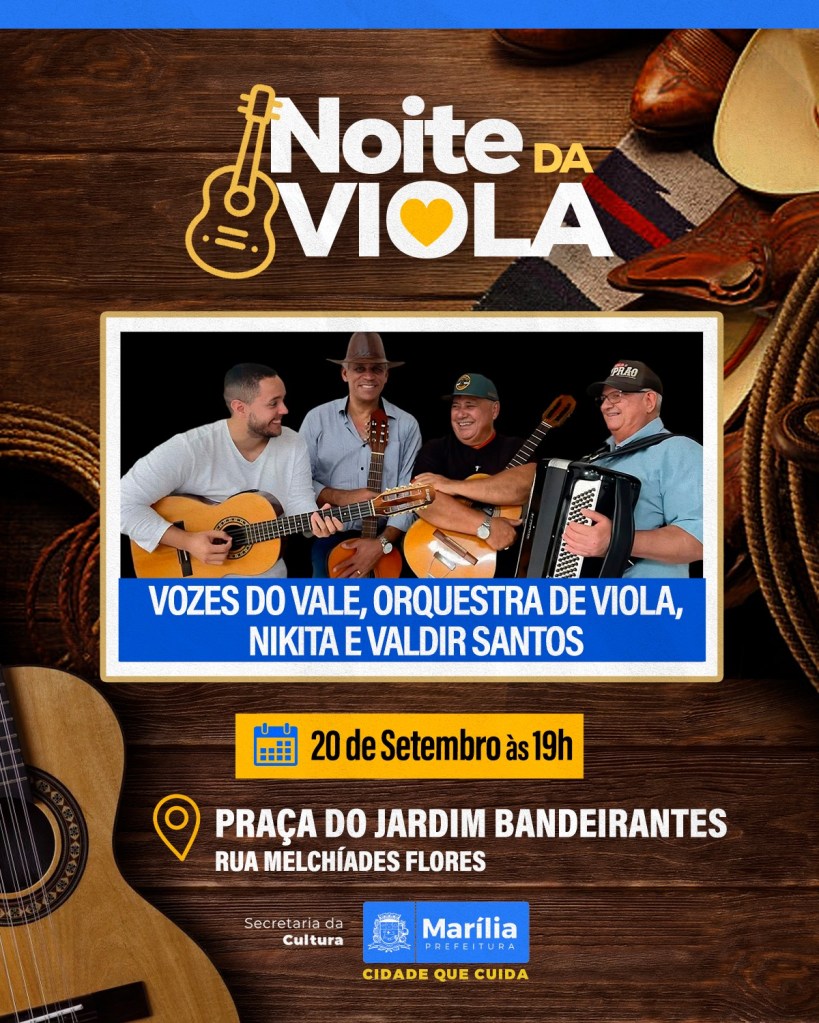 A Prefeitura de Marília, por meio da Secretaria Municipal da Cultura, realizará neste sábado, 20 de setembro, mais uma edição do evento Noite da Viola, que acontecerá na Praça do Jardim Bandeirantes, na rua Melchíades Flores. O início será às 19h.