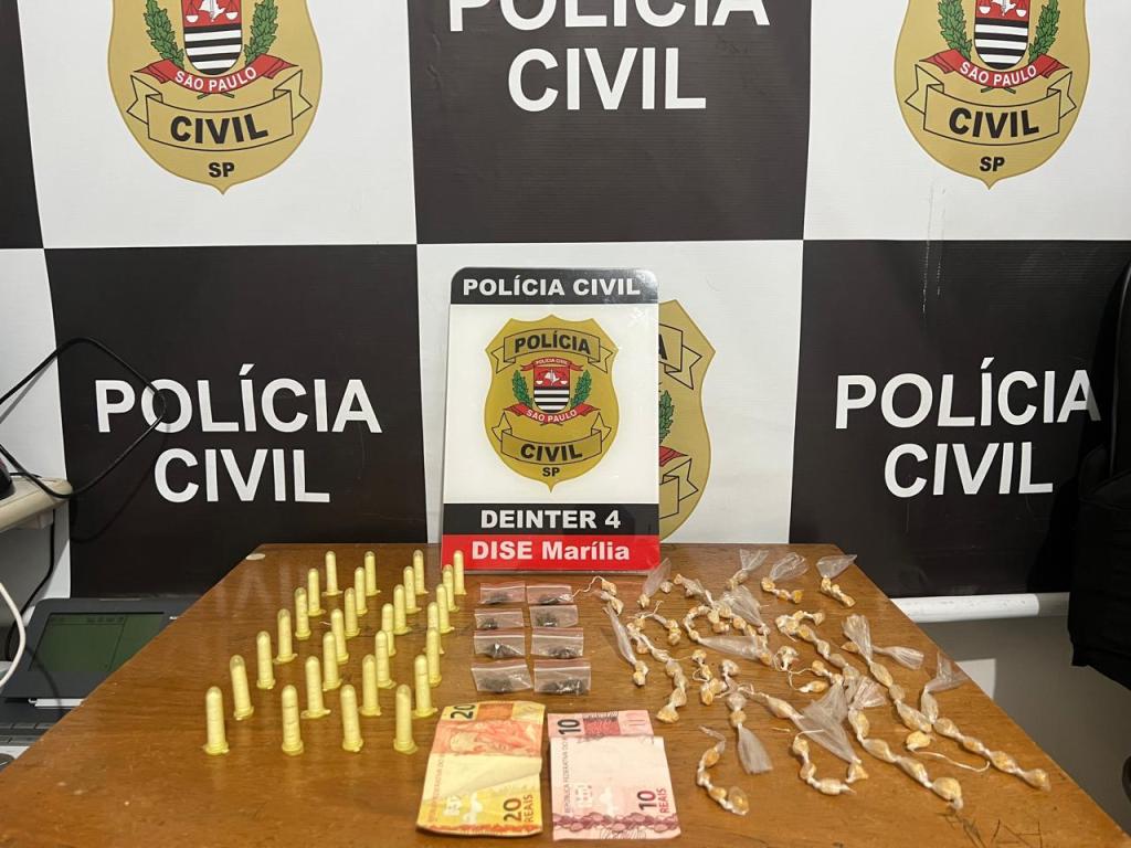 No interior do saco foram localizados R$ 30,00 em notas trocadas, 28 porções de cocaína, 8 porções de maconha e 93 pedras de crack, todas já fracionadas para comercialização. Conduzido à sede da DISE/Marília, o indiciado foi formalmente interrogado e confessou o crime, afirmando que vendia cada porção por R$ 10,00.