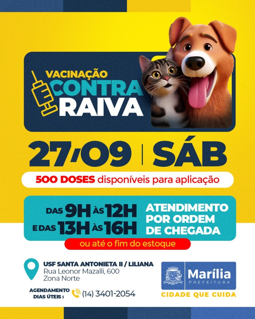 A Prefeitura de Marília, por meio da Secretaria Municipal da Saúde, vai realizar neste sábado (dia 27) nos períodos da manhã (das 9h às 12h) e da tarde (das 13h às 16h), ou enquanto durar o estoque, a 8ª ação de vacinação antirrábica do ano.