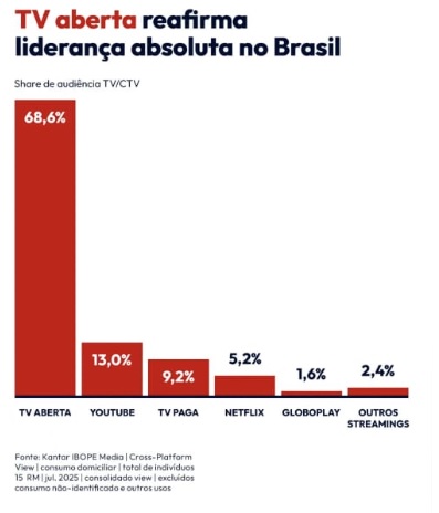 A narrativa do “fim da TV aberta” foi uma das maiores ilusões do marketing moderno. Enquanto gurus digitais prenunciavam uma era dominada por streamings e algoritmos, os dados consolidados da Kantar IBOPE Media contam uma história diferente e incontestável: a TV aberta mantém uma liderança absoluta com 68,6% de share de audiência. O universo do streaming (Netflix, Globoplay e outros) soma apenas 9,2%, e o YouTube, sozinho, tem 13%. Este abismo não é um resquício do passado; é a prova de que a neurociência do consumo não mudou.