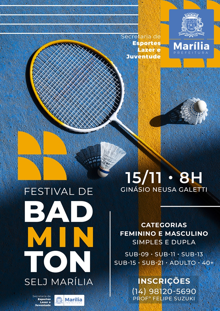A Prefeitura de Marília, por meio da Secretaria Municipal de Esportes, Lazer e Juventude (SELJ), realiza no próximo dia 15 de novembro (sábado), o Festival de Badminton, no Ginásio Neusa Galetti, a partir das 8h.