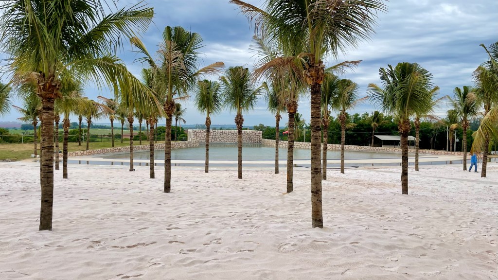 A paisagem ao redor foi pensada para completar a imersão. O Eco Thermas criou uma praia de quase 2 mil metros quadrados, o que equivale a 15 quadras de beach tennis uma ao lado da outra. A praia foi construída com areia de quartzo. Foram empregadas 725 toneladas do material, quantidade o suficiente para encher a carroceria de 25 caminhões. O contraste entre a areia branca e o azul da água forma um cenário digno de litoral, só que em pleno Interior de São Paulo.