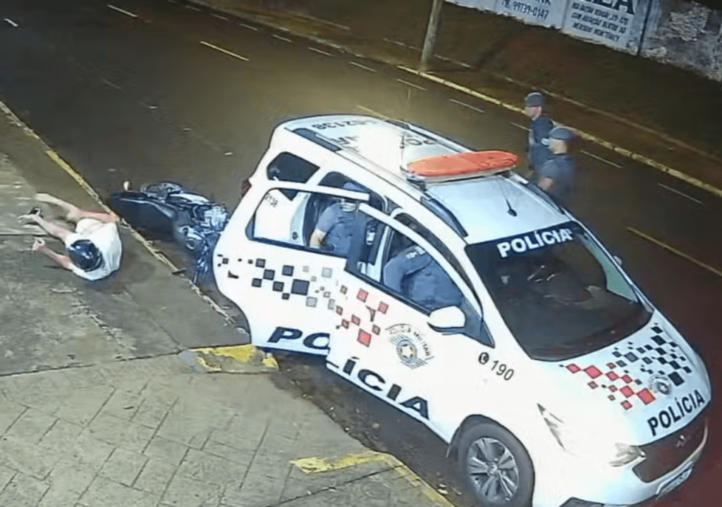 Câmeras de segurança flagraram a cena. As imagens mostram o motociclista fazendo a curva, desequilibrando-se logo em seguida e batendo diretamente na viatura. Quatro policiais, que se preparavam para entrar no carro, presenciaram o acidente.