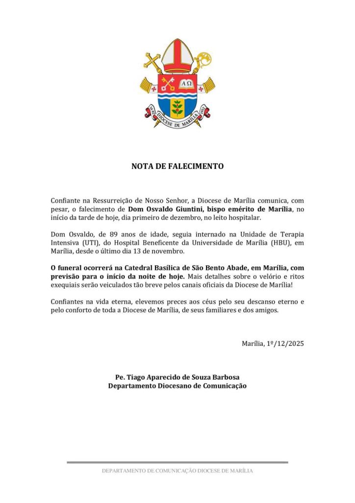 A Diocese de Marília comunicou, na tarde desta segunda-feira (1º), o falecimento de seu bispo emérito, Dom Osvaldo Giuntini, aos 89 anos. A nota oficial, divulgada pelos canais da instituição, expressa pesar pela perda, mas também gratidão pela vida e pela vocação do religioso, cuja trajetória marcou profundamente a Igreja local.