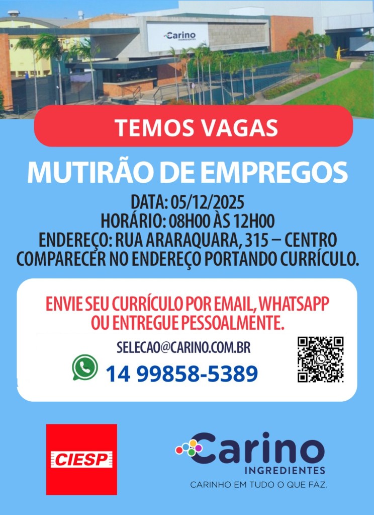 Já o 10º mutirão de emprego será realizado pela Indústria Carino, com oportunidades imediatas para quem busca ingressar no setor industrial. A ação tem como objetivo agilizar o processo seletivo e aproximar ainda mais os trabalhadores das empresas que estão contratando.