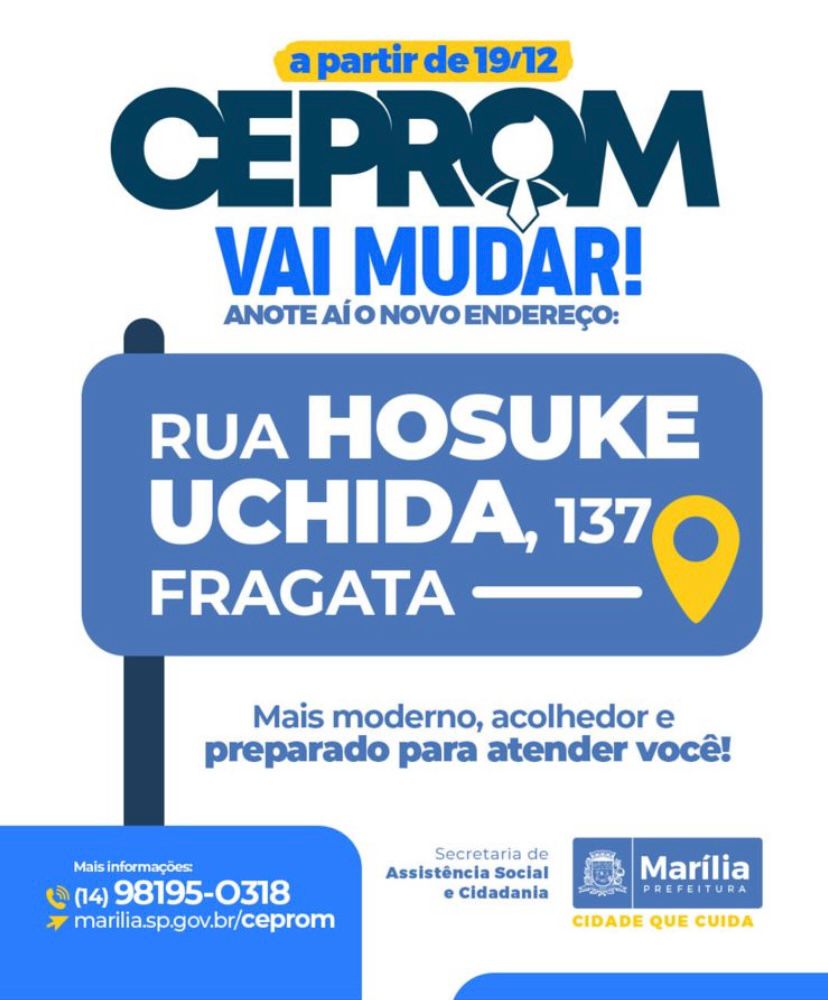 O CEPROM – Centro Profissionalizante de Marília, serviço da Secretaria de Assistência Social e Cidadania, inicia uma nova fase com a mudança para um novo endereço. A partir do dia 19 de dezembro, o atendimento será realizado na Rua Hosuke Uchida, 137, bairro Fragata, oferecendo melhor estrutura para receber a população e ampliar o alcance das ações de qualificação e empregabilidade.