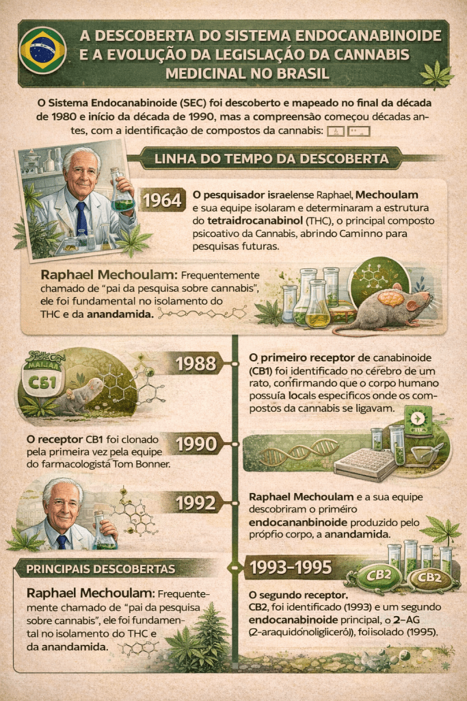 As pesquisas com esta planta, considerada um tesouro farmacológico pelo saudoso professor Raphael Mechoulam da Universidade Hebraica de Israel, ficaram muito restritas no século XX devido às políticas de combate às drogas que surgiram no começo dos anos 30. No entanto, tivemos a descoberta dos receptores canabinoides e também dos endocanabinóides (veja linha do tempo no infográfico abaixo) que são substâncias produzidas pelo nosso próprio organismo e que tem função muito peculiar, atuando em parceria com os sistemas nervoso, hormonal e imunológico, entre outros. O SEC foi descoberto nos anos 1990 e até hoje esse assunto não está nas graduações dos cursos de medicina ou odontologia. Por isso que não existe resistência, mas sim desconhecimento, tanto da planta quanto do SEC. Um dos meus propósitos como professor, pesquisador e médico de família e comunidade é realizar a divulgação científica levando informação de qualidade e demonstrando que temos diversos estudos clínicos realizados em humanos comprovando os efeitos terapêuticos da cannabis medicinal.