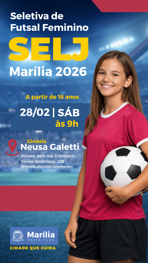 A Prefeitura de Marília, por meio da Secretaria de Esportes, Lazer e Juventude (SELJ), realiza no próximo dia 28 de fevereiro (sábado), a partir das 9h, no Ginásio Neusa Galetti, a seletiva de Futsal Feminino SELJ 2026.