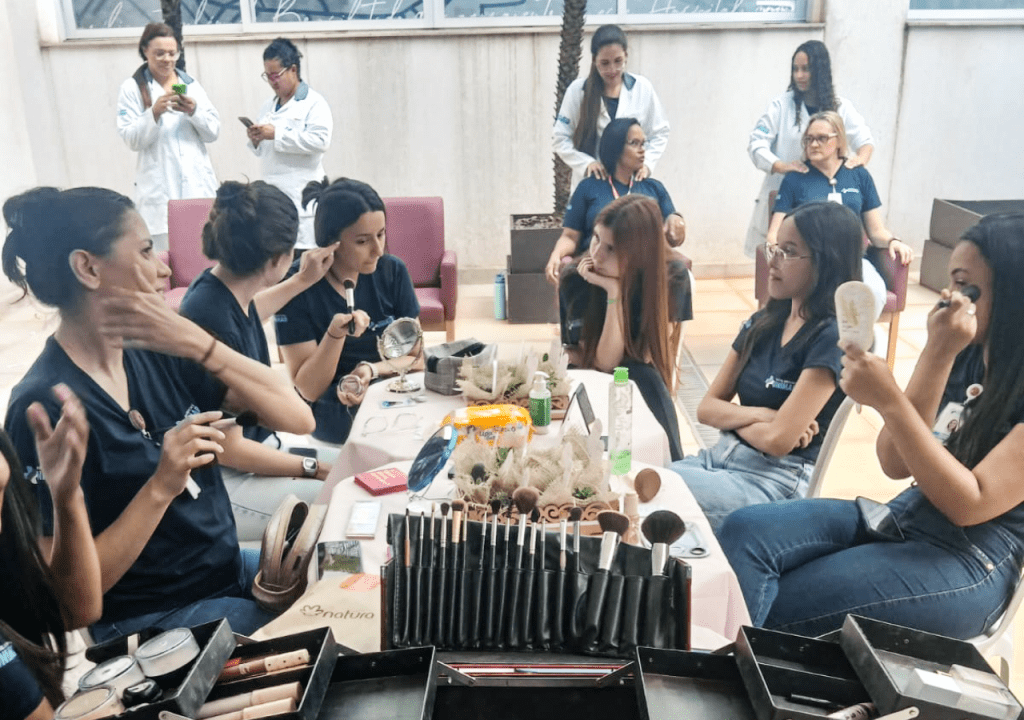 serviços de escova, esmaltação, design de sobrancelhas e maquiagem, proporcionando às participantes uma experiência de cuidado e autoestima. Além disso, Mariana Falconi, especialista em maquiagem, conduziu uma aula prática de automaquiagem, ensinando técnicas simples para o dia a dia, valorizando a beleza natural e promovendo a autonomia no autocuidado.